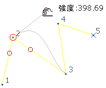 接線方向と強度を示すために、連続線は、黄色で選択ポイントに赤いハンドル、および、端末に丸がある 2 本の暗赤ラインで表示されます。