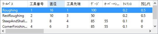 ツールパスリスト - NC プログラム内の全ツールパス、および、ツールパスの作成に使用されたパラメーターが表示されます。ツールパスを選択すると、ダイアログの下部にそれらに関する情報が表示されます。