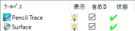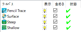 ツールパス一覧 - 当該工具を使用する全ツールパスおよび当該工具による加工内の干渉の有無を表示します。リストには、以下の 4 項目が表示されます。