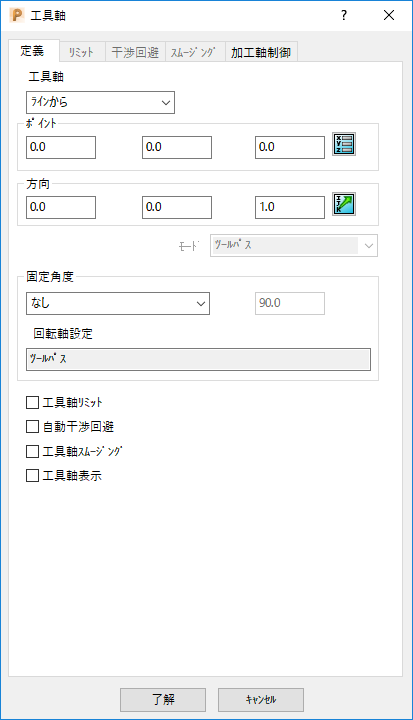[ツールパス編集] タブ > [編集] パネル > [工具軸] をクリックし、工具軸 ダイアログを表示します。