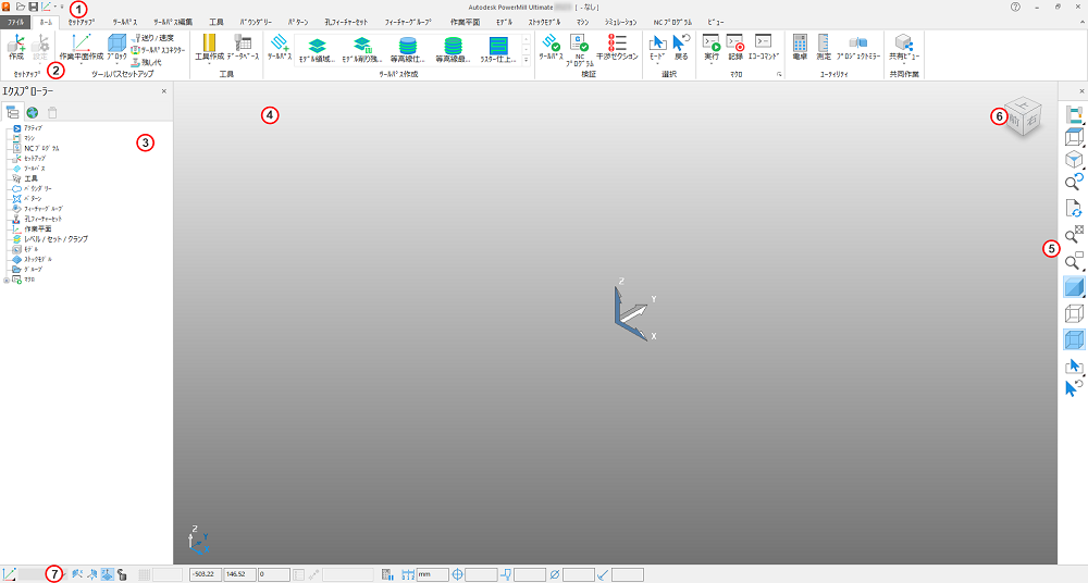 リボン - PowerMill の機能を管理する、複数のタブとパネルから構成されます。