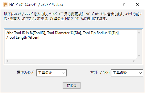 NC プログラムコマンド / コメントプリファレンス ダイアログでも変数の利用が可能です。このダイアログは、NC プリファレンス ダイアログ ツールパス タブの コメント ボタンをクリックして表示します。