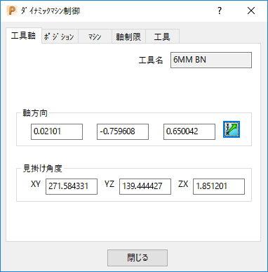 ダイナミックマシン制御 モードダイアログ 工具軸 タブには、ベクトル、および、見掛け角度で工具軸方向が表示されます。グラブハンドルを使用して工具軸を調整すると、値が自動更新されます。