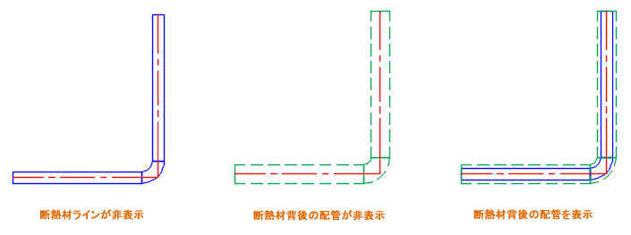 オルソ図面で配管オブジェクトに断熱材が表示されるようになりました。オルソ図面で、断熱(材)ラインを非表示にするか、断熱材の背後にある配管を非表示にするか、断熱材の背後にある配管を表示するかを選択できます。