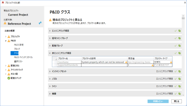 [プロジェクトの比較]では、Plant 3D の設定全体の類似点と相違点を解析できます。現在のプロジェクトを参照プロジェクトと比較できます。また、プロジェクト間で同期する項目を選択することもできます。