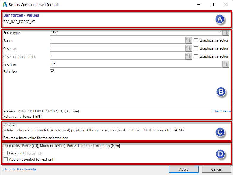 During the definition of arguments, in the dialog you can see a preview of the syntax formula, you can see the return unit and you can also check the value returned for this formula.