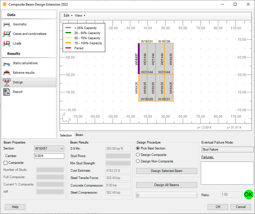 Design Selected Beam. It automatically selects the optimum section, number of studs, and camber for the beam selected in the graphic viewer.