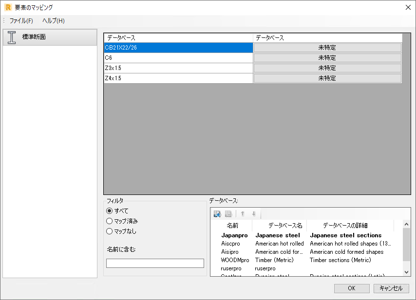 [部材のマッピング] ダイアログでは、以下のアイコンを使用して作業します。