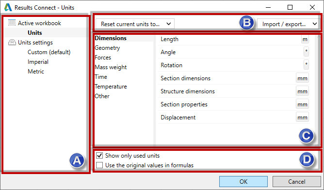 • Show only used units if you want to display the units which are used in the existing formulas.