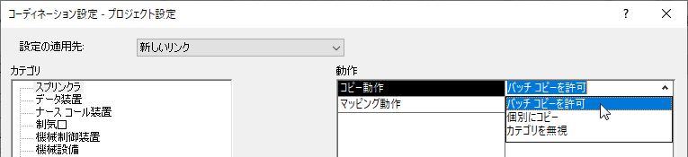 リンク モデルから MEP モデルに器具をコピーする前またはコピーするときに、コーディネーション設定を指定するダイアログで各器具カテゴリのコピー動作を指定します。
