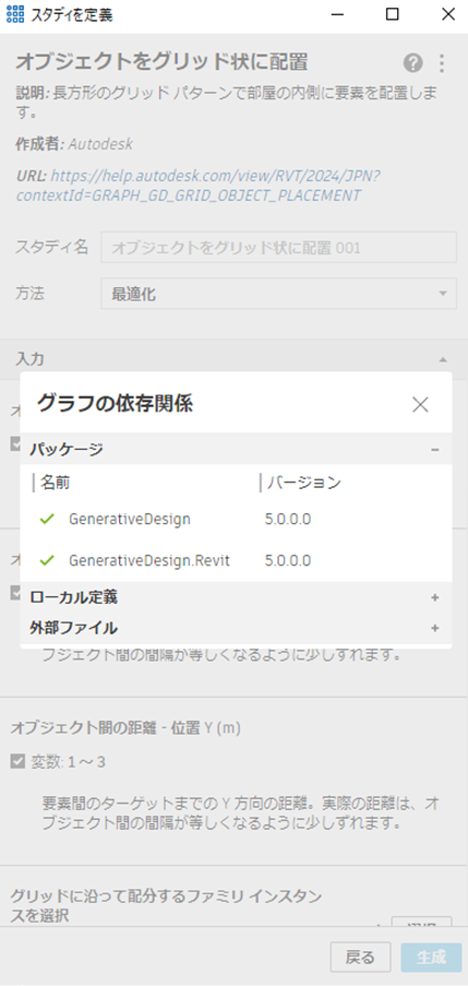 スタディ タイプを動かす Dynamo グラフを Revit のジェネレーティブ デザインで機能させるには、そのグラフにパッケージ、カスタム ノード、外部ファイルなどの特定の依存関係が必要になる場合があります。[グラフの依存関係]ダイアログでは、グラフを適切に実行するために必要なパッケージやその他の依存関係をすばやく確認し、見つからない依存関係を特定して Dynamo にインストールできます。