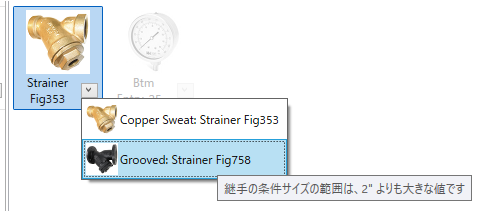 矢印をクリックすると、サイズに基づいた追加のパーツがドロップダウン リストに表示されます。このドロップダウン リストは、経路設定時の優先指定のように、部品種別の定義の条件によってコントロールされます。たとえば、ベンドの場合、特定のサイズまではプレス ベンドが使用され、それより大きなサイズの場合はセクション ベンドが使用されることがあります。リスト内のパーツの上にカーソルを置くと、ツールチップにパーツの条件に基づいたサイズの範囲が表示されます。