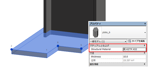次の例では、Advance Steel でベース プレートのマテリアルが「鋼 ASTM A53」に修正されています。その後、この修正が Revit プロジェクトに同期されます。修正前後の差異は、マテリアルの変更として認識されます。修正を適用すると、新しい値に応じてプレートのマテリアルが変更されます。