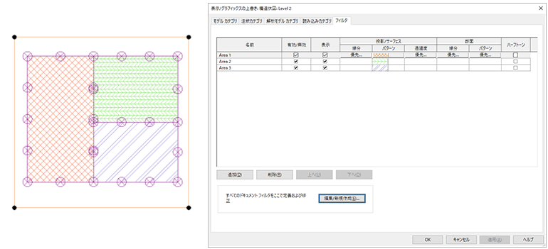 フィルタを使用して、平面図ビューで各面荷重の境界を荷重パラメータに基づいて識別します。