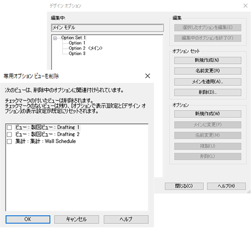 ビューは、[専用オプション ビューを削除]ダイアログの既定でオフになっており、削除するビューのみをチェックすることができます。以前は、削除するデザイン オプションで作成された製図ビューや集計表など、ビュー タイプの一部では、削除のチェックが入れられ、チェックを外すことができませんでした。