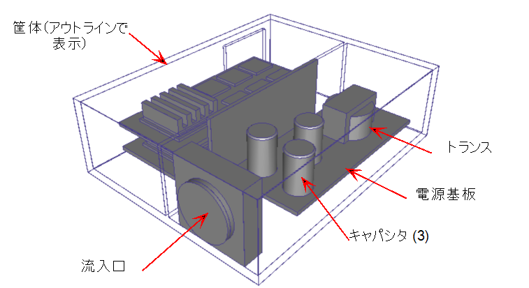 このチュートリアルでは、電子機器筐体内の流れと熱伝達をシミュレートします。このシステムにはいくつかのコンポーネントが含まれており、ここでは、コンパクト熱モデル、内部ファン、および分布抵抗(多孔質媒体)などの Autodesk® CFD の材料デバイス モデルを使用してこれらをモデル化します。