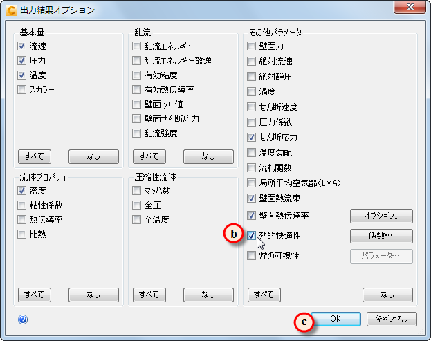 - b. [出力結果オプション]ダイアログで、[熱的快適性]チェックボックスをオンにします。