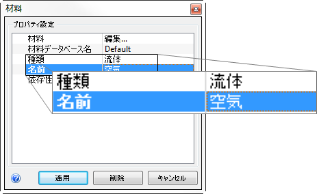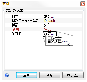 4. [材料]クイック編集ダイアログで、[種類]が[流体]で、[名前]が[空気]であることを確認します。
