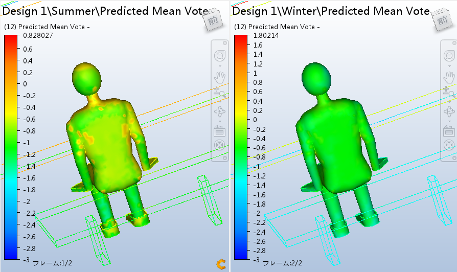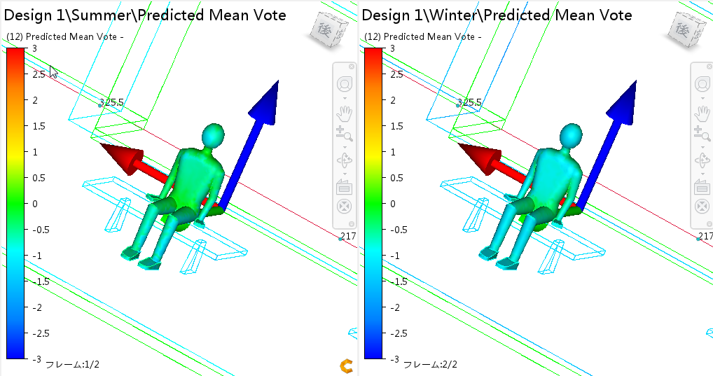 サマリ プロットから、どちらのシナリオにおいても、利用者の体全体で著しい温度勾配(2 度近く)が発生していることが分かりました。