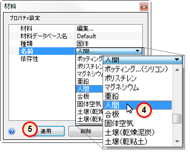 このステップでは、人間の熱物理特性をシミュレートする材料を利用者に割り当てます。インストールされている既定の材料データベースには、実際の「人間」の材料は含まれていないため、ここでは、類似物としてシリコンを使用します。より厳密にするには、人間の実際の特性値で材料を作成し、それをカスタムの材料データベースに追加してください。