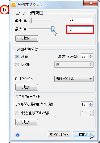 - b. [最大値]スライダを 3 にします。([最大値]スライダが 3 より小さい場合は、3 とキー入力することが必要になることもあります)。閉じるをクリックします。