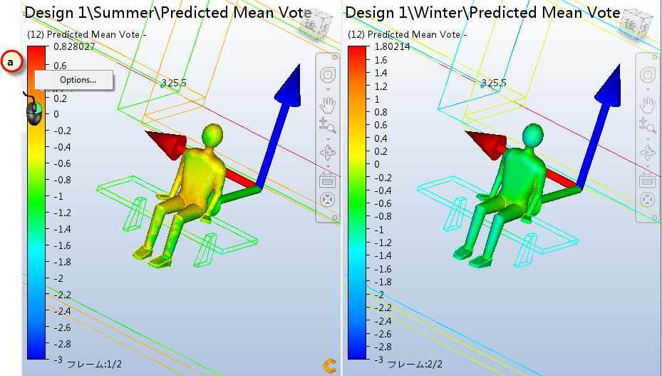 注: これらの解析結果によると、夏季シナリオでは利用者の左足がかなり寒いようです。その点を除き、利用者の正面部は、夏季向け設計の日も冬季向け設計の日と同様に快適のようです。しかし、まだ終わりではありません。