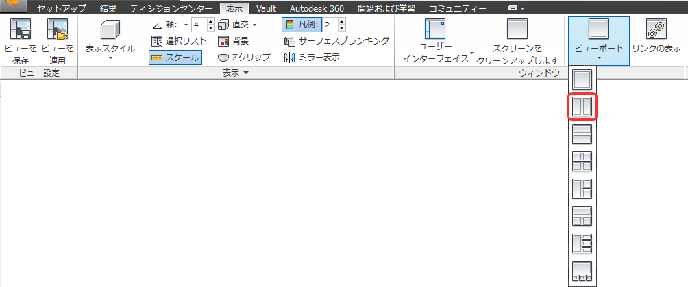 2. ビューを2つのビューポートに分割します。 このためには、[表示]タブ > [ウィンドウ]パネル > [ビューポート]の順にクリックします。垂直分割オプションを選択します。