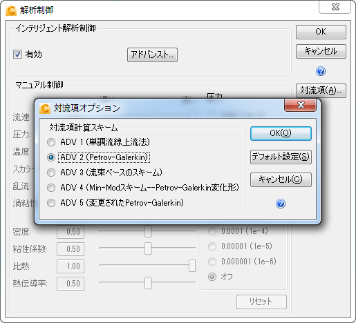 実行ダイアログで、解析制御をクリックし、対流項をクリックします。対流項オプションダイアログで、ADV2を選択します。OKをクリックし、解析制御ダイアログでOKをクリックします。