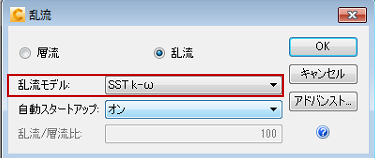[乱流]ボタンをクリックします。[乱流]ダイアログ ボックスで、[乱流 モデル]を[SST k - ω]に設定して、[OK]をクリックします。