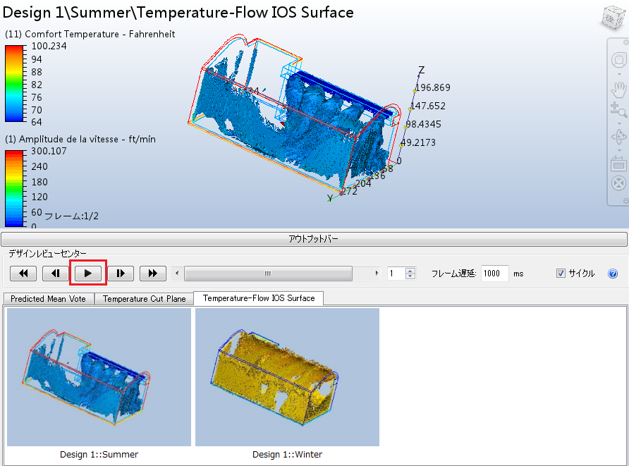 前のステップでは、会場の中央における温度を調べ、夏季と冬季のシナリオで著しい差があることが分かりました。このステップでは、等値面のサマリー イメージを使用して、流れと温度の相互作用についてさらに理解を深めます。