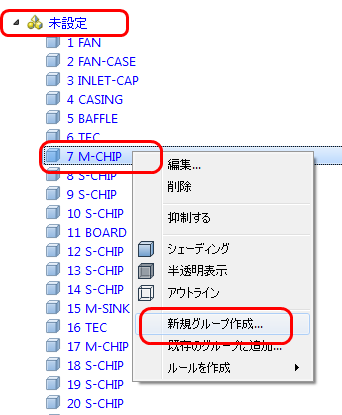 デザインスタディバーの材料ブランチを展開します。[M-CHIP]という部品を右クリックし、[新規グループ作成]を選択します。