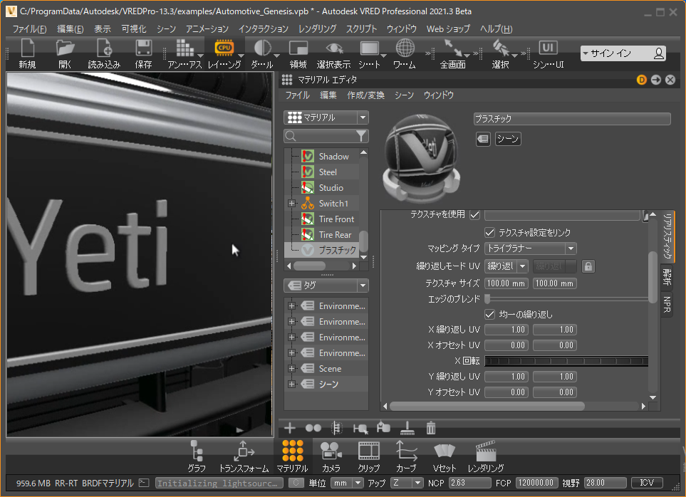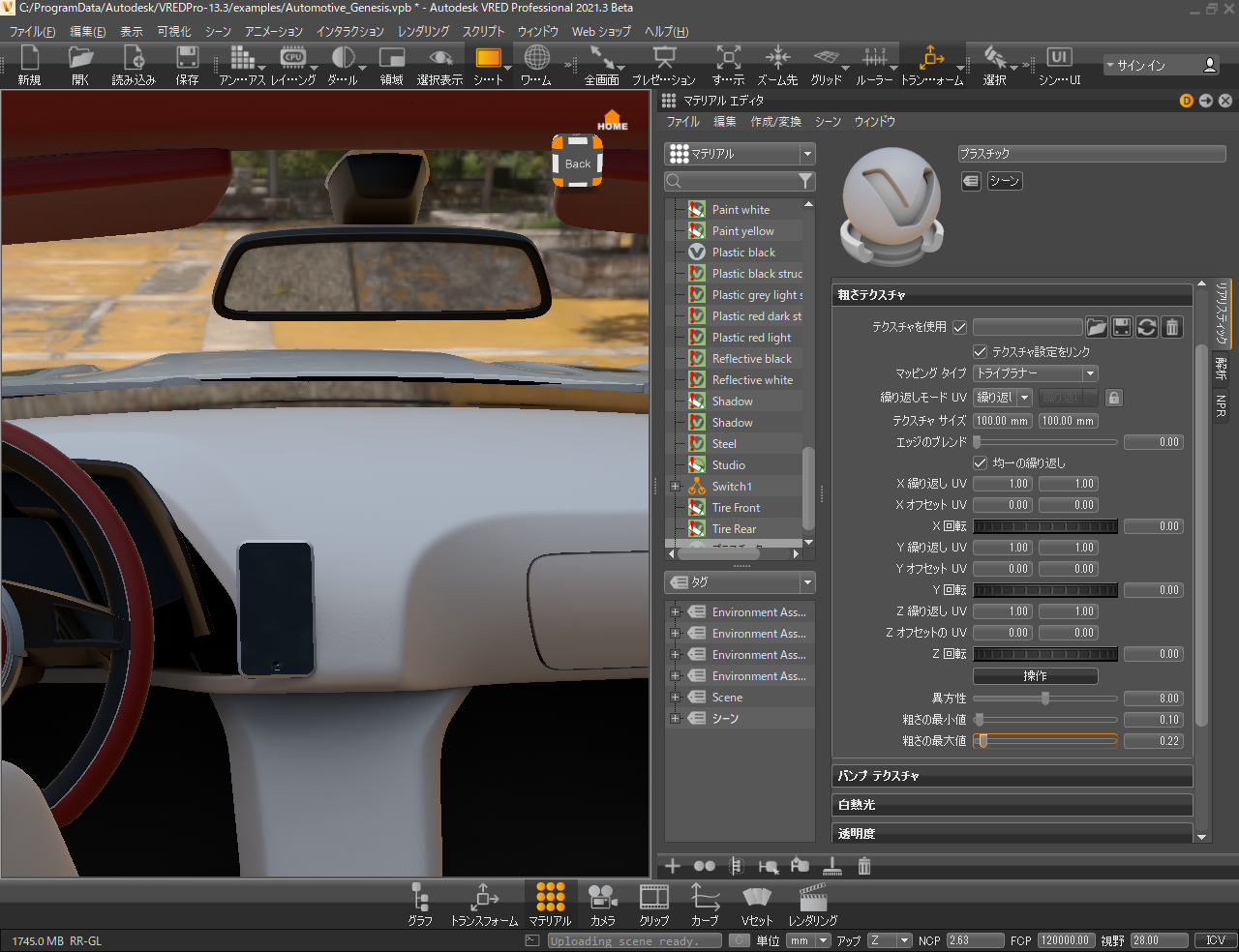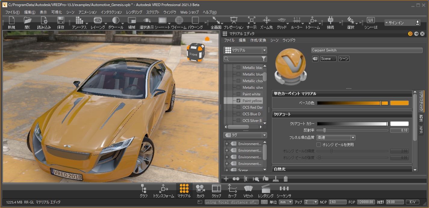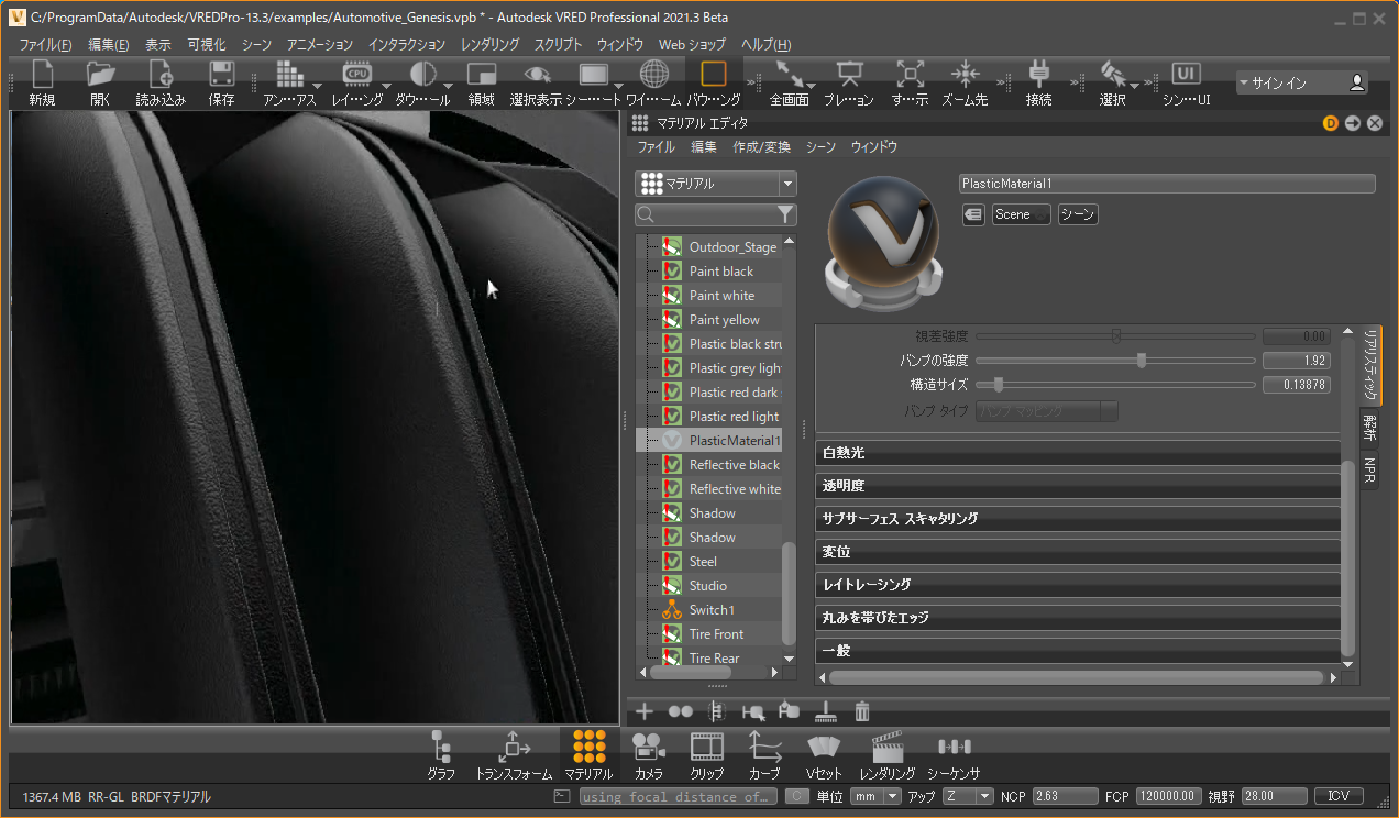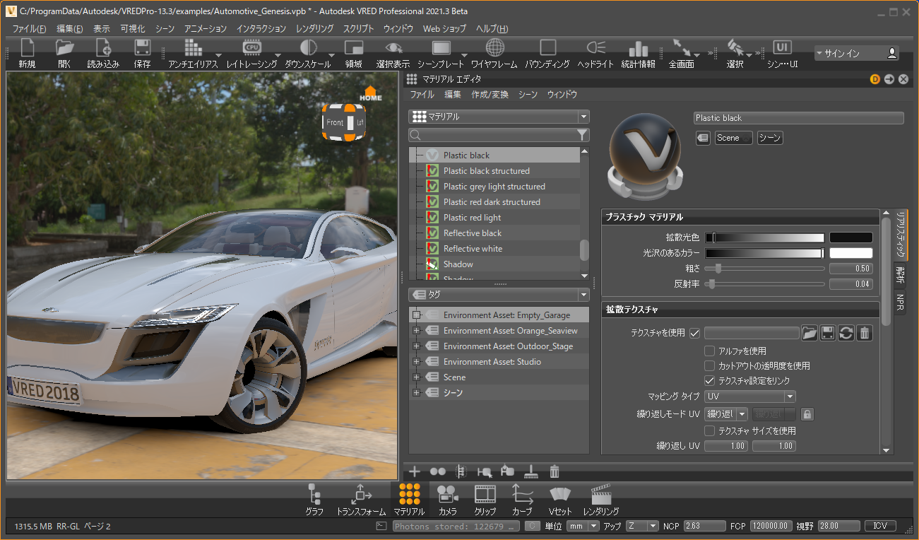 VRED マテリアルおよびマテリアル ツールのリファレンス情報については、「リファレンス」の「 マテリアル 」のセクションおよび「リファレンス」の「 環境 」のセクションを参照してください。