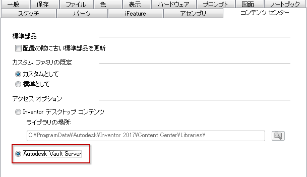 - Inventor の[アプリケーション オプション]ダイアログ ボックスで、コンテンツ センター ライブラリに Vault を使用するように Inventor が設定されていることを確認します。