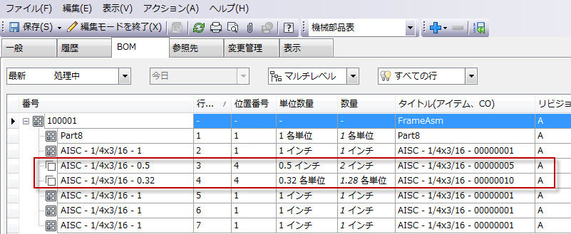 BOM 行をグループ化すると、BOM には 1 つの行のみが表示されます。特別に指定しない限り、表示される値は 1 次 BOM 行のプロパティを表します。