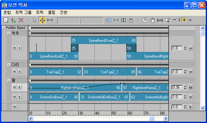 트랙 그룹이 작성되면 기본적으로 하나의 레이어 트랙이 지정됩니다. 그러나 각 트랙 그룹에 여러 트랙을 추가할 수 있으므로 각 몸체 부분 세트에 대한 모션 믹싱이 가능합니다. 예를 들어 팔에 대한 트랙 그룹을 작성하고 이 트랙 그룹 내에 두 개의 트랙을 만들 수 있습니다. 그런 다음 각 트랙에 완전히 다른 모션 세트를 배치하여 모션 중 다른 시간에 한 트랙 또는 다른 트랙의 가중치를 사용할 수 있습니다. 트랙 가중치 조정을 참조하십시오.