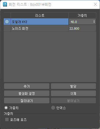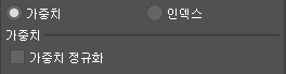 기본적으로 나열된 각 제어기의 가중치 설정은 100.0으로 설정되어 있습니다. 이 설정을 변경하여 제어기가 오브젝트에 미치는 효과를 증가 또는 감소시킬 수 있습니다.