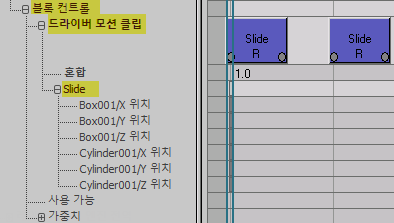 블록을 만들 때마다 블록 내의 모든 트랙이 구동 제어기에 할당됩니다. 이 제어기를 사용하면 드라이버 블록에서 키 데이터를 전송할 수 있습니다. 구동 제어기 트랙은 블록 생성에 사용한 원본 트랙과 함께 표시됩니다. 구동 매개변수 대화상자를 참조합니다.