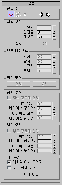 힘줄 하위 오브젝트의 컨트롤은 힘줄 롤아웃에 있습니다.