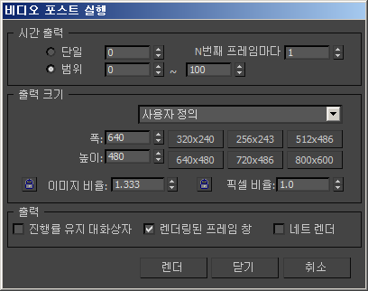 비디오 포스트 실행 컨트롤이 렌더 설정 대화상자에 있는 컨트롤과 비슷하지만 설정이 독립적이며 서로 영향을 주지 않습니다.