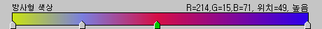 그라데이션은 플래그를 사용하여 서로 다른 색상과 밝기 값을 놓으려는 그라데이션 바를 따라 포인트를 나타냅니다. 플래그 간의 색상은 렌즈 효과로 자동 보간됩니다. 각 렌즈 효과 그라데이션에는 플래그가 최대 100개까지 포함되어 있습니다. 현재 플래그는 초록색으로 강조 표시됩니다. 그라데이션 바의 위치 번호는 그라데이션의 전체 길이를 기준으로 현재 플래그의 위치를 나타냅니다.
