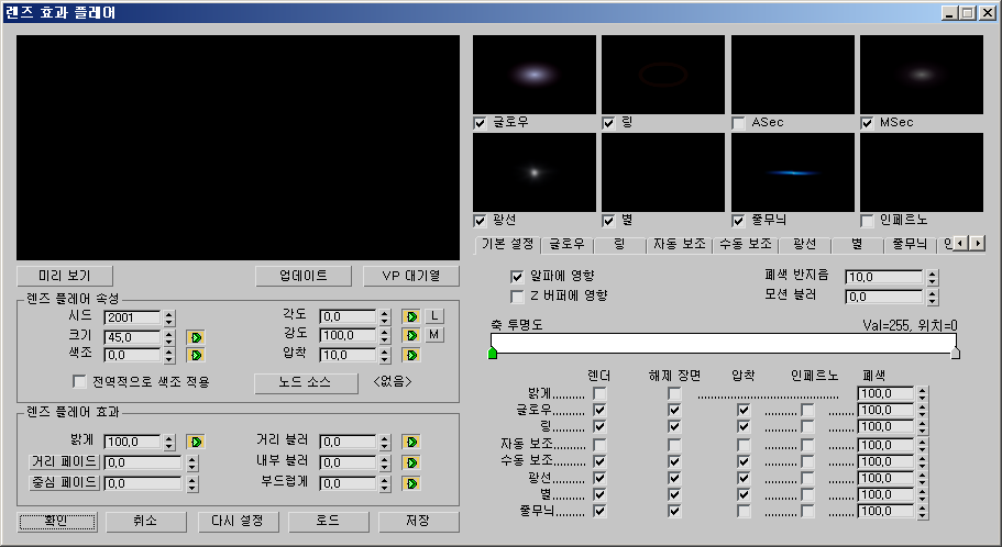 페이드, 밝기, 소프트닝 등 플레어의 특정 효과를 제어합니다.