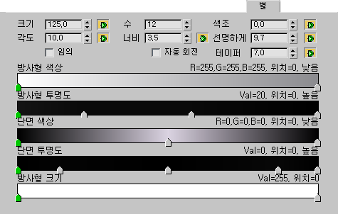 두 개의 그라데이션인 단면 색상 및 단면 투명도를 제외하고 그라데이션은 다른 부분의 별 효과와 동일합니다. 이 옵션은 "부드러운" 느낌의 스포크를 만들 때 유용합니다. 두 그라데이션은 각 스포크의 중심에서 바깥 가장자리 방향으로 작동합니다.