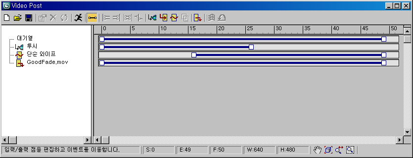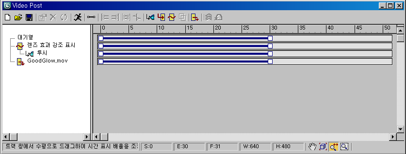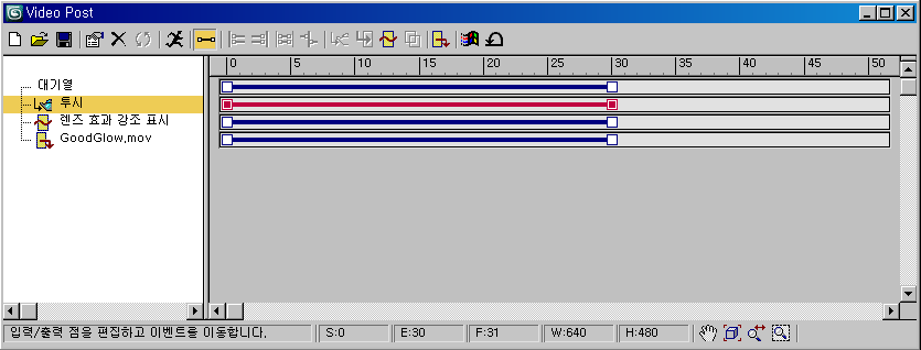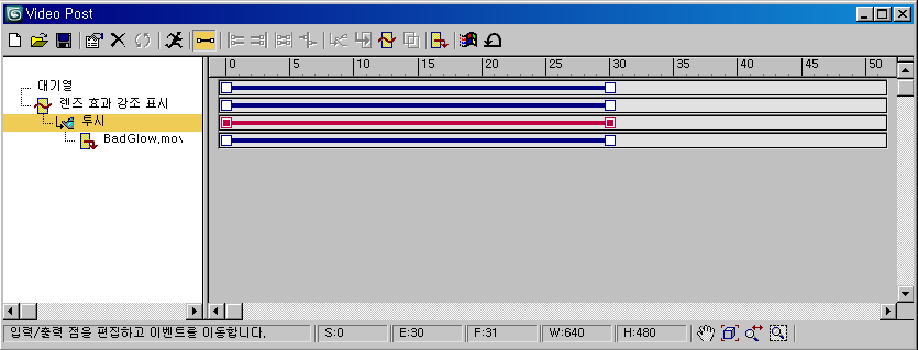 이 번에도 역시 대기열의 이벤트는 모두 올바릅니다. 하지만 이 문제에서는 대기열의 이벤트 순서가 잘못되었습니다. 이 문제는 흔히 다른 이벤트를 추가하는 중에 이벤트를 선택하는 경우에 발생합니다. 이 경우에는 렌즈 효과 글로우 및 출력 이벤트가 추가될 때 투시 이벤트가 선택되었습니다.