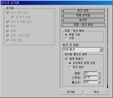 피지크 초기화 대화상자를 사용하여 피지크 링크에 생성할 외피의 유형 및 크기와 링크 매개변수를 명시합니다.