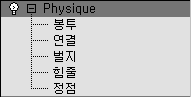 피지크 수정자에는 5가지 하위 오브젝트 레벨이 있습니다. 각 종류의 하위 오브젝트에는 다양한 컨트롤이 있습니다.
