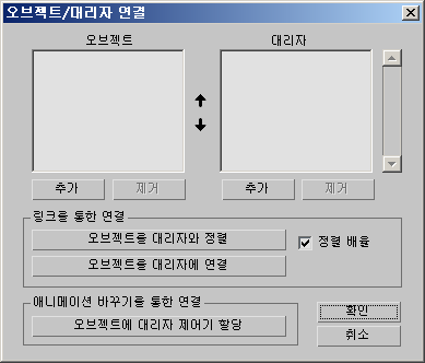 이 대화상자를 사용하여 원하는 수만큼 대리자-오브젝트 쌍을 링크할 수 있습니다. 또한 이 대화상자를 사용하여 대리자에 맞게 오브젝트를 정렬하고 선택적으로 배율 조정 요소도 일치시킬 수 있습니다. 마지막으로, 오브젝트가 대리자의 제어기를 사용하도록 지정할 수 있습니다.