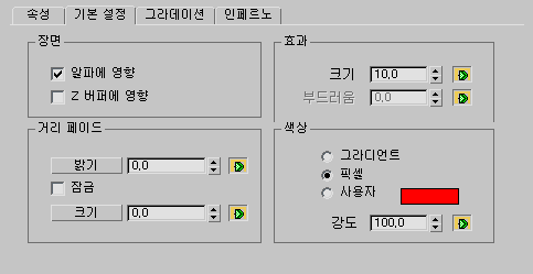 - 카메라로부터의 거리를 기준으로 글로우 효과의 크기를 페이드할 수 있습니다. 대부분의 경우 글로우가 카메라에서 멀어질수록 글로우의 전체적인 크기가 줄어듭니다. 이 매개변수는 애니메이션할 수 있습니다.