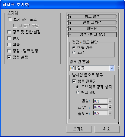 피지크 초기화 대화상자의 초기화 그룹에서는 재설정할 설정 카테고리 이름을 지정합니다. 처음에 피지크를 메시에 적용한 경우 이러한 설정은 사용 불가능하게 표시되었습니다. 실제로 모든 설정은 초기화에서 설정됩니다.
