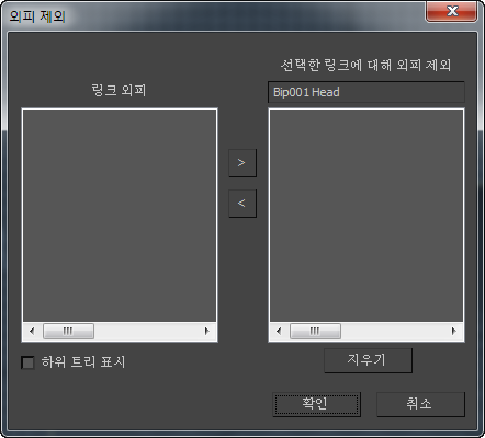 외피 하위 오브젝트 수준에서 이 대화상자를 사용하면 다른 링크에 영향을 주는 링크를 제외할 수 있습니다. 예를 들어, 오른쪽 허벅지 링크가 왼쪽 허벅지 링크에 영향을 주는 것을 제외할 수 있습니다. 또는 검지 외피가 중지 정점에 영향을 주는 것을 방지하기 위해 배율을 조정하는 대신 검지 링크에서 중지 링크를 제외할 수 있습니다.