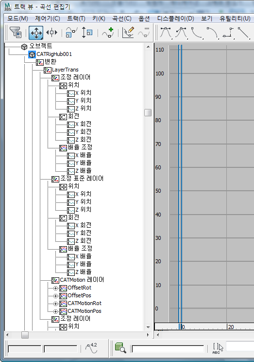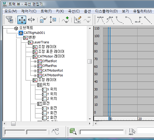 작업 공간을 간소화하기 위해 CAT에는 기본적으로 활성 레이어의 제어기 및 키프레임만 표시됩니다. 레이어에서 작업할 때는 활성 레이어의 키프레임만 표시되면 수행 중인 작업을 쉽게 파악할 수 있습니다.